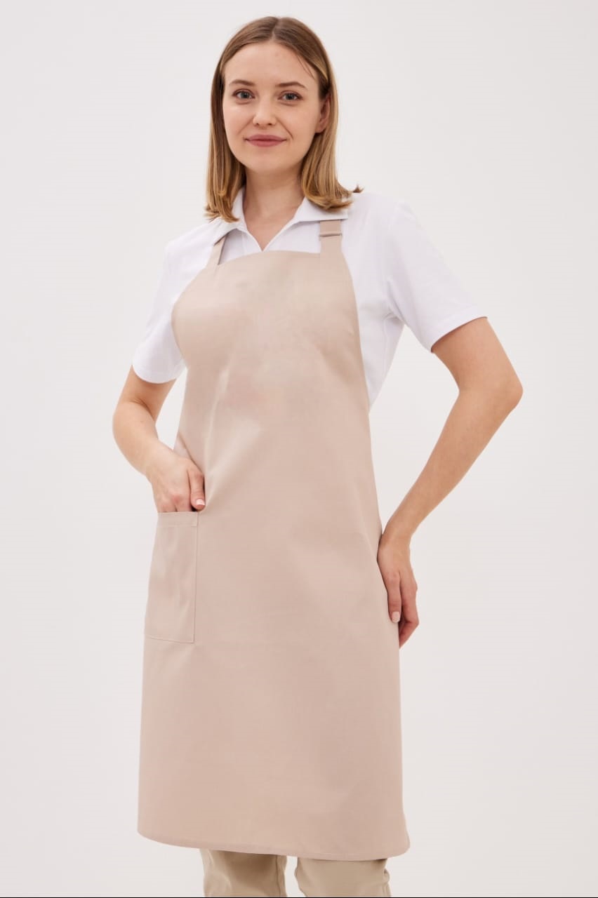 Длинные завязки обеспечивают регулируемую ширину обхвата на талии, так же завязки на шее регулируютя с помощью металлической пряжки. Дополнительные закрепки в углах кармана и на поясе делают его износостойким и надежным. Фартук дополнен вместительным карманом. Возможно нанесение вышивки или печати логотипа на грудке фартука.