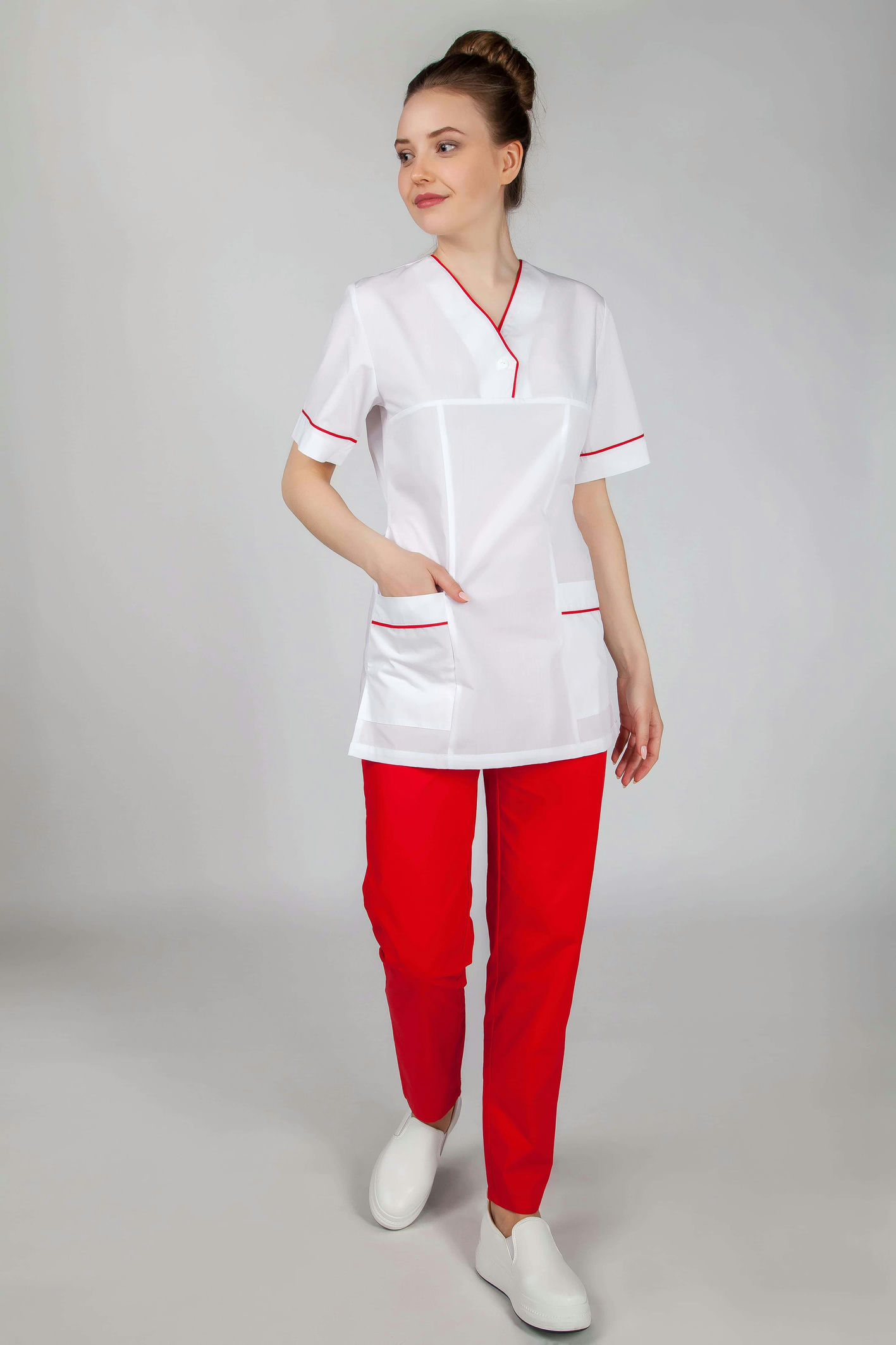 Туника с Y-образным вырезом и застежкой на 1 пуговицу, короткий рукав, рельефы на полочке и спинке, карманы по бокам с прямым входом, разрезы в боковых швах. Отделка кантом по горловине, обтачкам кармана и рукавов. Брюки зауженные к низу, на поясе с эластичной лентой и шнурком.